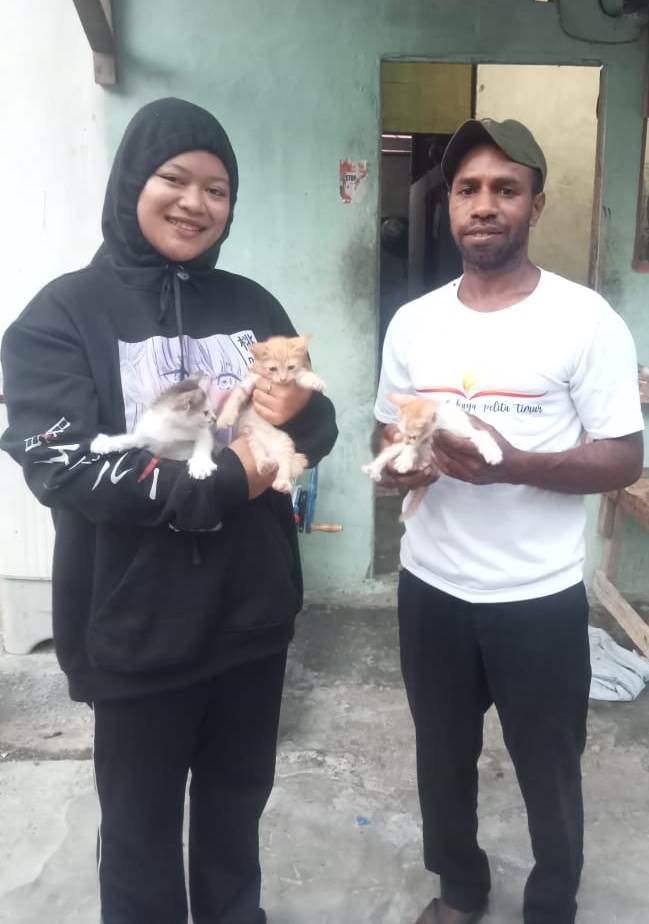 Di kampung saya, di Manokwari, Papua Barat, tidak seperti di kota-kota besar yang fasilitasnya sudah lengkap. Tempat tinggal saya belum ada shelter untuk menampung kucing terlantar. Kondisi ini akhirnya membuat saya berinisiatif untuk merawat dan memberi makan para kucing yang tidak terurus ini.